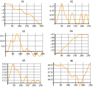 Unlike the serial manipulator, the parameters presented in the transformation matrix are not all independent because some of them are already constrained by the loop-closing constraint equations as listed in the $DerivedParametersB record. Fortunately, this does not cause a problem because the ReplaceDrivingVariables function appends the constraint equations of the IKP to the $DerivedParametersB record. In the case of changing independent parameters (stored in the $DrivingVariables and $SimpleParameters records), the solver lumps together all constraint equations and solves them. Thus all constraints imposed either by loop-closing or IKP are satisfied.