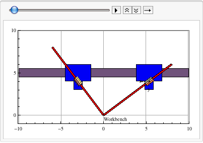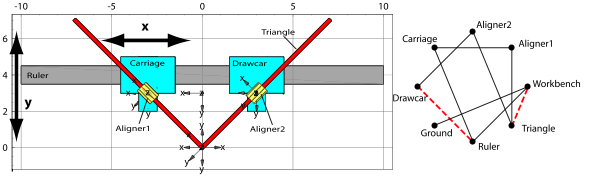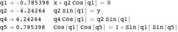 The big disadvantage of the augmented method is that it requires a special solver even in the case of kinematic modeling. However, if we could eliminate the redundant constraint equations before solving them, a simple solver like FindRoot could be employed. One natural solution would be to let the user resolve the problem. This way the independent constraint equations can be further processed—even solved in closed form if there is a solution; therefore, they are better suited for parametrized mechanism modeling.
