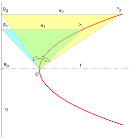 Corollary 1 implies the working principle of the parabola-drawing mechanism: if a right-angled triangle is rotated in the vertex of the parabola, the third side of the triangle touches the points of the parabola. The mechanism should naturally be designed in such a way that the side BP of the triangle (see Figure 1) should move up and down along line
