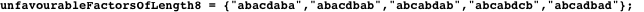 As an example, in the case of four letters, the following words together with their permutations and mirror images are unfavorable (forbidden) factors.