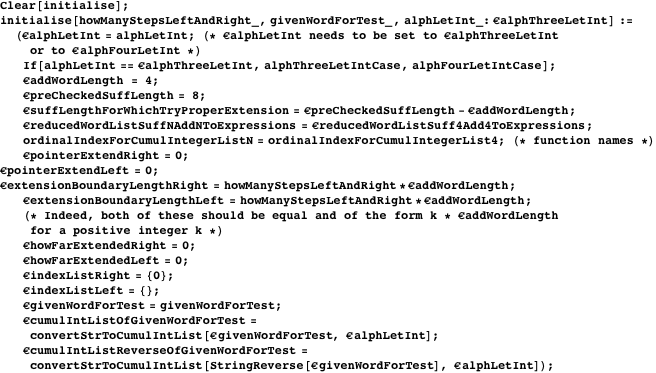 The programs and some of the structures involved are quite complicated and would have been very hard to develop without using Mathematica. We have been using integer coding and cumulative integer lists for words incorporated into quite extensive precomputations. Moreover, certain symbolic representations for words and Mathematica‘s pattern matching properties (for lists and strings) have been extremely useful.