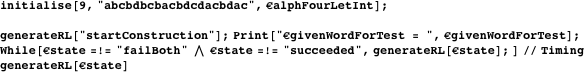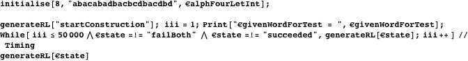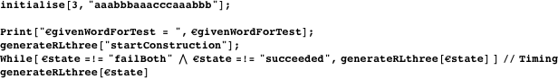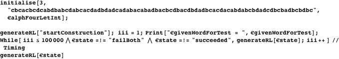 state). As mentioned earlier, some of these states include "extendOrChangeRight", "extendOrChangeLeft", "testRight", "testLeft", "failBoth", and "succeeded". You can see the program for generateRLthree by opening the cell brackets at the end of this article. Note that even though the program was originally developed for the three-letter case (allowing short abelian repetitions of the form