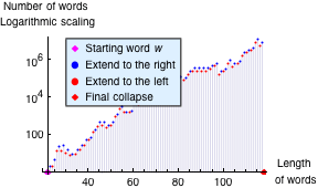 . The length of the words increases only by one letter at a time (alternately to the right and left). All possible words are gathered in a list and the number of words is plotted according to their length. For each word there are four possibilities: it can be continued with 3, 2, 1, or 0 letters. The case of 0 letters means that the word cannot be continued (in an a-2-free way) at all. If no words can be continued, then we get an empty list and the computation ends. The resulting list consists merely of unfavorable (or bad, or forbidden) factors that start from the original given word, and this starting word is “in the middle” of every nonempty word in the list. Indeed, all the computations for the words in the list of someUnfavourableFactorsOfLength20, together with a great many other similar words, do end with an empty list (i.e., with a dead end) even though the width of the bidirectional tree, and the computational time, can be huge. All this can make finding unfavorable factors really challenging.