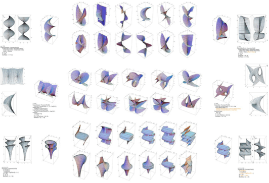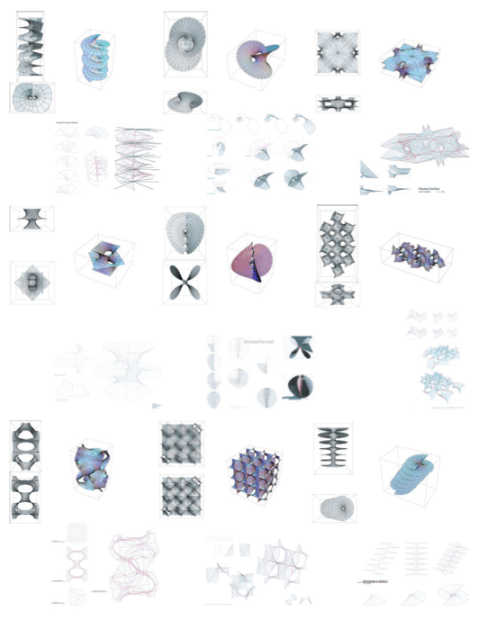 We first looked at the possibility of reinventing the George Washington Bridge Bus Station in New York City, originally designed by Pier Luigi Nervi. The studio started with common surfaces documented in Modern Differential Geometry of Curves and Surfaces with Mathematica by Alfred Gray. Enabled by Mathematica, the students were able to gain quick access to parametrically plotted surfaces. With the help of Mathematica notebooks from Matthias Weber of Indiana University, the students progressed into more advanced minimal surfaces. Students conducted a series of compositional diagrams and stereolithography models to understand the complex symmetries and bipolar spatial relationship brought about by the kaleidoscopic patching composition of minimal surfaces. Given these new advances in equation-based surfaces coupled with advances in manufacturing and fabrication, the studio speculated on how to evolve the vocabulary of Nervi and the other masters of reinforced concrete.