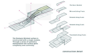 The central translational corridor of the proposed Parachute Pavilion evolved from symmetrical manipulations of a basic module of the mathematically derived Riemann minimal surface. Based on the mathematical logic and the scale of the resulting minimal surface, the Pavilion surface was analyzed as an independent load-bearing structure. The remainder of the Pavilion structure would be resolved following investigation of the central surface.