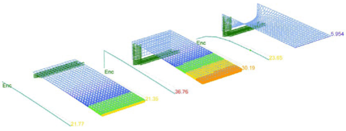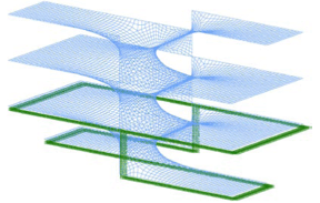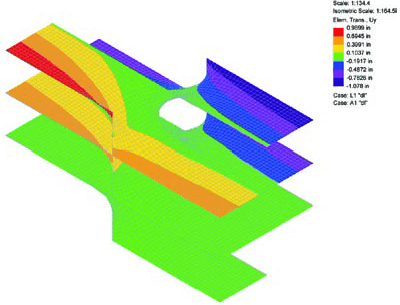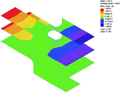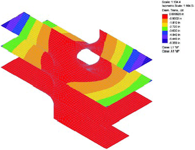 The deflections and stress patterns of the initial uniform surface analysis are analogous to a central vertically rigid element (column) with equivalent cantilevered horizontal elements (beams). This structural system yields maximum deflections at the ends of the cantilevers and large tensile stresses in the horizontal members across the top of the vertically rigid element (column). Deflection limits characteristically govern the required depth of the horizontal (beam) structure, and the system is particularly sensitive to unbalanced loading conditions.
