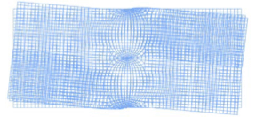 The vertical deflections of the surface are largest at the extreme unsupported ends (top surface) and are symmetric about the center. The horizontal deflections of the surface are largest at the points farthest from the central rigid element and indicate that the structure is rotating—almost an identical amount at both ends—about the central stiff element.