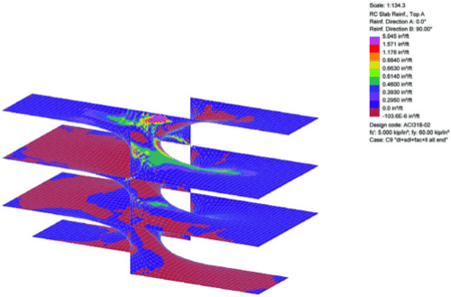 In combination with the weight of the structure and any applied material loads (facade, floor finishes), building codes specify a minimum live load be applied to structures based on occupancies. The live loads are applied across the entire horizontal surface as well as to alternating spans in order to fully represent the nature of an inhabited space with respect to people flow and congregation. Finite element analysis of the structure under the various load combinations proved that alternately locating the live loads across the surface was the most onerous analysis case, as it caused unsymmetrical deflection and stresses in both the vertical and horizontal elements.