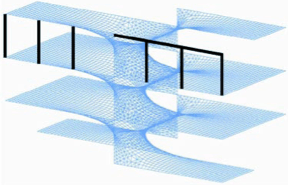 By studying the properties of geometric figures or solids that are not changed by homeomorphisms, topology puts preference on flexible formal relationships. Thinking topologically comes out of a desire to focus on the possibilities of three-dimensional relationships that exist outside of Cartesian-defined geometry. It is important that the flexibility does not substitute for precision in form making, but rather enables the exploration of the precise intricate relationships inherent in mathematical surfaces. The surfaces are not seen as the means to an end, but rather the motivating diagram for complex connections.