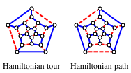 In 1857 Sir William Rowan Hamilton invented the Icosian game [1]. In a world based on the dodecahedral graph, a traveler must visit 20 cities, without revisiting any of them. Today, when the trip makes a loop through all the vertices of the graph, it is called a Hamiltonian tour (or cycle). When the first and last vertices in a trip are not connected, it is called a Hamiltonian path (or trail). The first image shown is a tour; the second is a path.