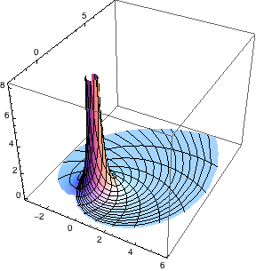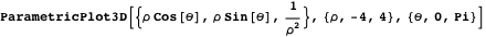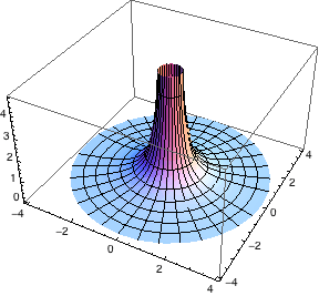 Below is a standard plot of a portion of the surface in cylindrical coordinates. It is not too difficult to convince oneself using this plot and one’s imagination that the fourth power of the distance from the origin to the tangent plane is proportional to the curvature at each point. For example, consider the region between the flat base and the narrow funnel parts, where the magnitude of the curvature is modestly positive. This is precisely where the tangent plane is nearly perpendicular to the position vector, and so there is a correspondingly modest distance from the origin to the tangent plane that is approximately equal to the length of the position vector. As one moves away from this region to a region of smaller curvature (down into the flatter base), the tangent plane is now nearly horizontal and nearly passes through the origin, indicating a correspondingly short distance between the origin and the tangent plane.