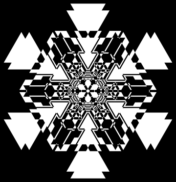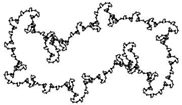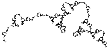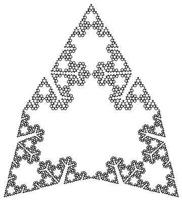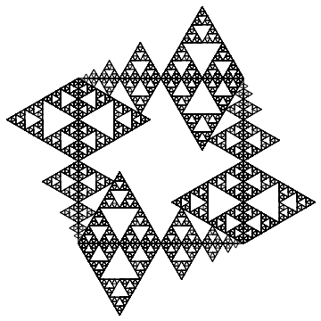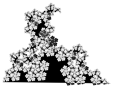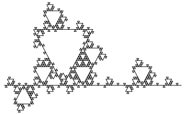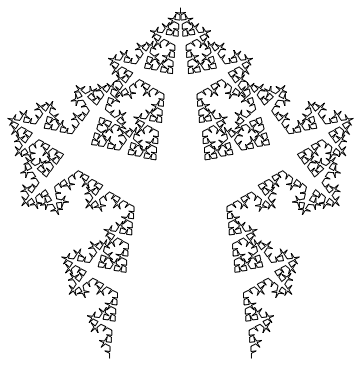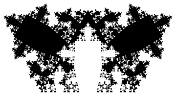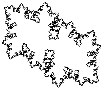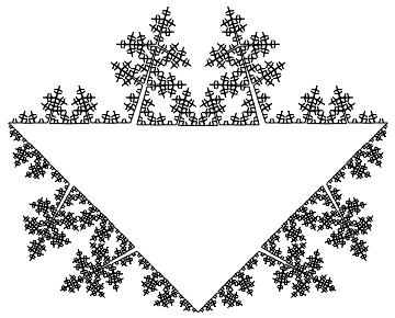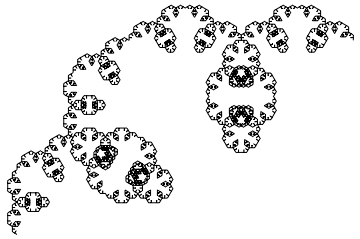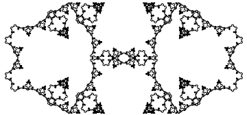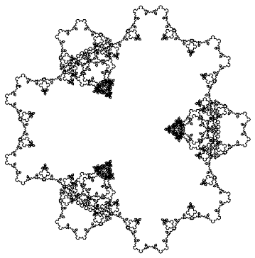 Notice that the above graphic is covered by seven (approximately) similar copies of itself. In the first three graphics, as can be seen from the axes, the larger the number of iterations, the larger the graphic in real terms. From now on, except in one case, we omit axes.