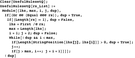 . The second rule will never be invoked and the ruleset will thus be a duplicate of a simpler ruleset. - Any case with two rules with left-hand sides