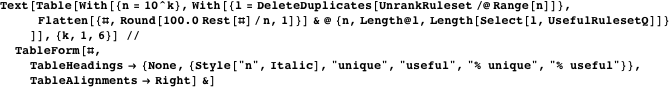 Some are true duplicates (if the index number changed), the others functional duplicates containing rules that will never be invoked in creating a sequential substitution system. This is a manageable situation. Remember, Cantor’s diagonalization contains an infinite number of duplicates of each fraction! The following table summarizes the numbers of unique rulesets and useful (functionally distinct) rulesets for several orders of magnitude. Roughly three-fourths of the generated rulesets are unique, although fewer and fewer of the unique rulesets will give distinct sequential substitution systems.