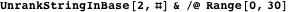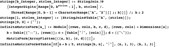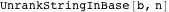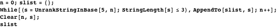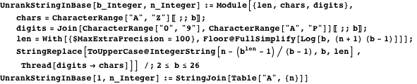Note that UnrankStringInBase could even be used in an infinite loop, iterating through all strings for a given set of symbols, listing shorter strings before longer ones. In the following loop, rather than using While[True, ], we stop when the string length exceeds three.