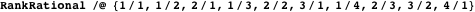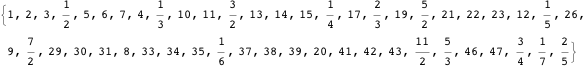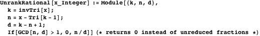 Since this method of listing the rationals includes duplicates, the UnrankRational function returns 0 instead of a duplicate. However the nonzero fractions returned are unique and appear in the defined order.