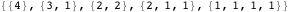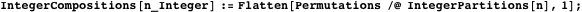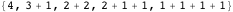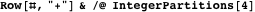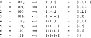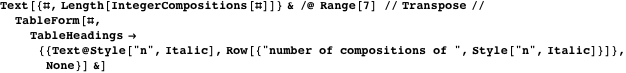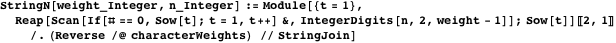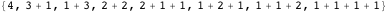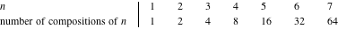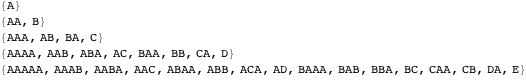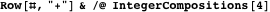 to specify whether commas or pluses are placed between 1s, we can use ternary numbers and let the digits 0, 1, and 2 designate end-of-string, comma (end-of-character), or plus sign, respectively. This generates all possible lists of strings of total weight