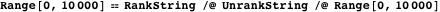 It appears that RankString functions correctly and gives back the index that generated each string. Here is a slightly longer test.