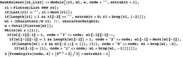 The final line adds the number of rulesets of smaller weights to the reconstructed quaternary code, left-shifts the result, adds the extra bit flag at the end, and finally subtracts 1 in order to start at 1 instead of at 2. Again, other alphabets may be accommodated by adjusting characterWeights, an unspecified alphabet by removing the replacement code.