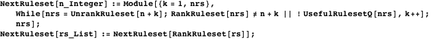 Now we create an increment function to advance to the next (unique and useful) ruleset. Initially we only test whether RankRuleset returns the same index, but we already include the option of additional tests.