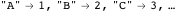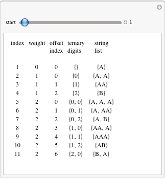 In practice it would be faster to iterate on the integer index and convert to the string for use. To use a different alphabet for this enumeration and those that follow, one need only change the definition of characterWeights.