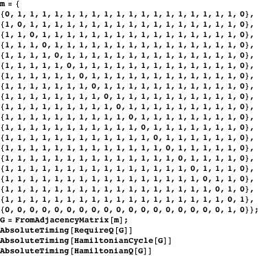 Here we can see that in huge graphs it is better to run the RequireQ function first, because it is possible that Mathematica will search for a long time when there is no Hamiltonian cycle in the graph at all. So it might be useful to build the function RequireQ into the HamiltonianQ and HamiltonianCycle functions in Mathematica.