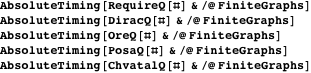 In the following individual examples, HamiltonianCycle runs 10 times more slowly than the theorems. The difference grows with the size of the graphs because searching for Hamiltonian cycles is an