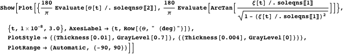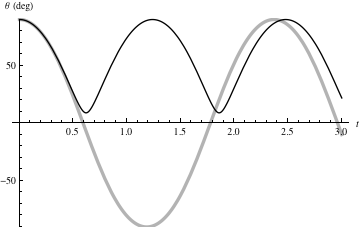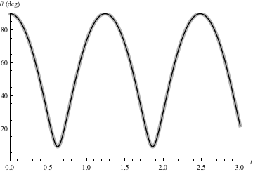 and, irrespective of the oscillation amplitude, equation (10) describes the motion of a highly super-nonlinear pendulum. As in the previous section, applying DSolve fails to generate symbolic output, so again we use the same set of initial conditions and solve the equation numerically. The solution of the equation of motion in the polar coordinate system should match the Cartesian results. As shown in Figure 6, the agreement is perfect.