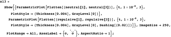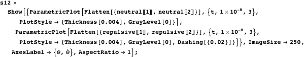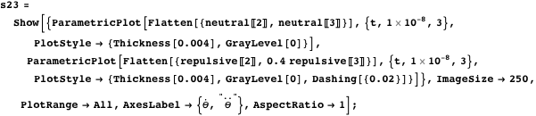 Figure 9. The solid and the dashed curves are the “phase diagrams” of the uncharged and the charged pendulums, respectively.