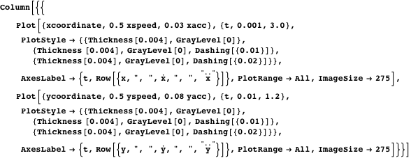 Figure 5. In both graphs, the solid, short-dashed, and long-dashed curves correspond to position coordinates and their associated speed and acceleration, respectively. For the sake of clarity, in the left graph