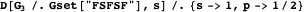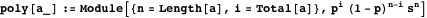 The program uses conv to convert a string to a binary list and poly to convert a binary list to the probability of generating that string, further multiplied by