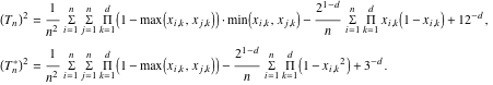 These formulas are implemented in the corresponding functions EDiscrepancySqd and EStarDiscrepancySqd.