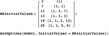 The initial values listed in Numerical Recipes [3] are only sufficient to generate a sequence of six dimensions. Consequently, we adopt the initial values provided by Joe and Kuo [5] as the default option for generating Sobol sequences.