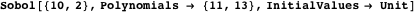 Joe and Kuo [5] provide a set of initial values designed to minimize bad projections between pairs of variables. They provide initial values for all polynomials up to degree 18 (21200 dimensions), and claim that they satisfy property A up to 1111 dimensions. The implementation of Lemieux, Cieslak, and Luttmer [12] gives values for 360 dimensions selected on the basis of an optimization. The British-Russian Offshore Development Agency (BRODA)—with which Sobol is affiliated—sells proprietary software to generate sequences with up to 1024 dimensions. Alternatively, Jäckel [6] advocates a randomization procedure to select initial values in higher dimensions.