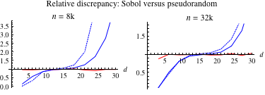 The following graph compares the discrepancy of Sobol sequences of varying length relative to the expected discrepancy of a purely random sequence, using the two measures of discrepancy. We observe that the two measures are broadly consistent, both indicating that the relative advantage of the quasirandom sequence dissipates with increasing dimension. (The horizontal axis is scaled in binary thousands, that is 1024.) Star discrepancy has generally been favored as a measure because it can be used to bound integration error (see [9, 10]).