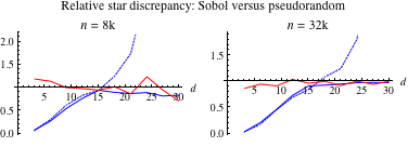 The next graph makes the same comparison using the star discrepancy. Under this measure, the quasirandom sequence (blue) appears to remain competitive with the pseudorandom sequence (red) for higher dimensions. We conclude that the evaluation of the relative performance of quasirandom versus pseudorandom sequences at higher dimensions depends upon the measure of discrepancy used. This graph emphasizes the importance of initial values. The dashed curve shows the relative star discrepancy of a Sobol sequence constructed with unit initialization deteriorates dramatically at higher dimensions.