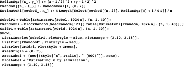 from a low-discrepancy sequence of varying sizes, bracketed by the estimates from a rectangular grid (green) and a pseudorandom sequence (red) of identical size. We observe that the low-discrepancy sequence generally provides a more accurate estimate than the rectangular grid, and a significantly better estimate than the pseudorandom sequence. (This input takes a long time to evaluate.)