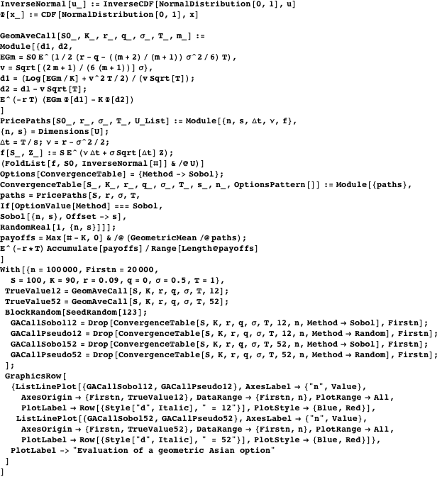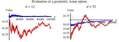 , simulating weekly averaging. The axes are drawn at the true value. The law of large numbers ensures that simulated value will converge to the true value eventually. However, as we observe in this diagram, this convergence may be very slow. In both cases, the quasirandom simulation (blue) converges faster than the pseudorandom simulation (red), though the advantage erodes as the number of dimensions increases. We find that the superiority of Sobol sequences in practical applications extends to higher dimensions than might be suggested by considering discrepancy alone. In this example, quasirandom simulation based on a Sobol sequence shows markedly better convergence than pseudorandom simulation, even in a problem of 52 dimensions. Galanti and Jung [11] report extensive comparisons of pseudorandom and quasirandom simulation in financial applications. They observe that quasirandom simulation remains competitive with pseudorandom simulation up to at least 250 dimensions, which would correspond to daily averaging in a one-year option. (This input takes a long time to evaluate.)