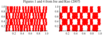 These examples underline the importance of the choice of initial values. Joe and Kuo [5] select the initial values specifically to improve these two-dimensional projections. We restore these as the default.