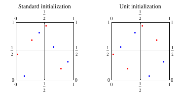 ), and the red points are the next four points. In the left-hand graphic, we observe that the blue points belong to different subsquares, as do the red points. This conforms with property A. This is not the case in the graphic on the right, which is constructed from analogous points in a sequence with unit initialization. The second sequence does not satisfy property A.
