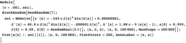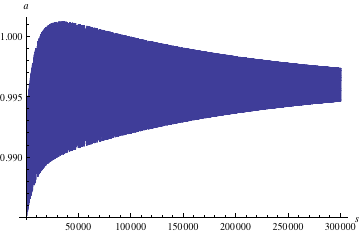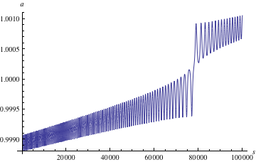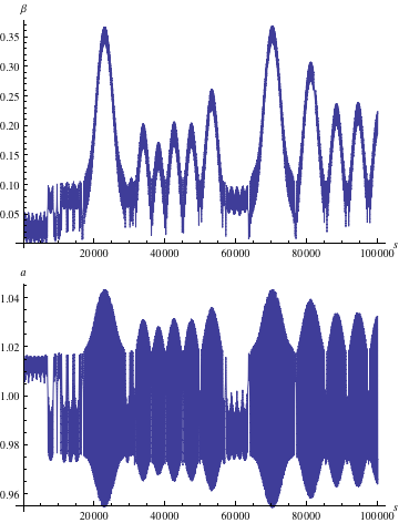 One can see that the solution, under these circumstances, occasionally becomes quite chaotic (very sensitive to initial conditions), in which case