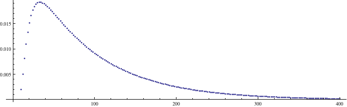 Using this function, we can now easily find and display the corresponding distribution of the game’s duration.