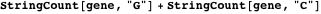 We use StringCount to count the number of occurrences of G or C in this sequence.