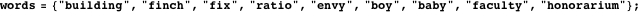 Now we will find all the words in the dictionary file that comes with Mathematica that are ordered in this way; we will use Select to return those words that pass the test. Finally, we randomly sample 40 of them.