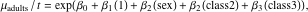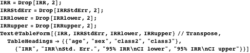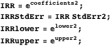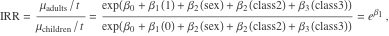 . Thus, our interpretation is that adults survived at roughly half the rate at which children survived, among those of the same sex and class. The standard error of IRR is found by multiplying the estimated IRR by the standard error of the coefficient (see [1]), while a confidence interval for IRR is found by exponentiating the confidence interval for the coefficient. Thus we obtain the following.