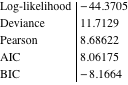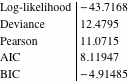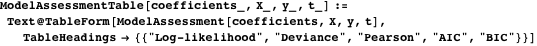 Commonly used model fit statistics include the log-likelihood, deviance, Pearson chi-square dispersion, Akaike Information Criterion (AIC), and Bayesian Information Criterion (BIC).