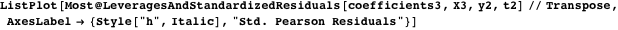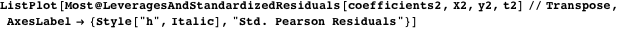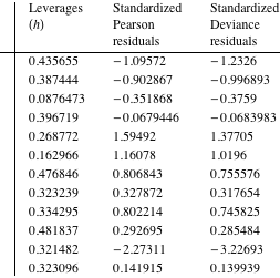 Comparing to the full model, we see that the assessment statistics have improved (they are smaller, indicating a better fit), and the Standardized Pearson residuals with high leverages are within the recommended boundaries. It appears that the model has been improved by dropping class2.