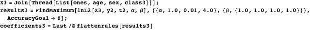 We set up the design matrix, with indicators 1 for adults and males, and using indicator variables for second class and third class, which means first class will be a reference.