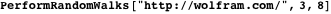 One may wish to perform multiple random walks from the same URL. This can be accomplished by using PerformRandomWalks. Like RandomWalkWeb, we specify the start URL and the maximum number of steps to be taken. Additionally, we pass the number of random walks