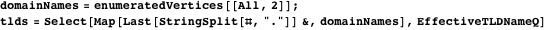 First, the domain names are extracted from the list of enumerated vertices. We then extract the last part of each domain name and use EffectiveTLDNameQ (see Appendix) to filter the results.